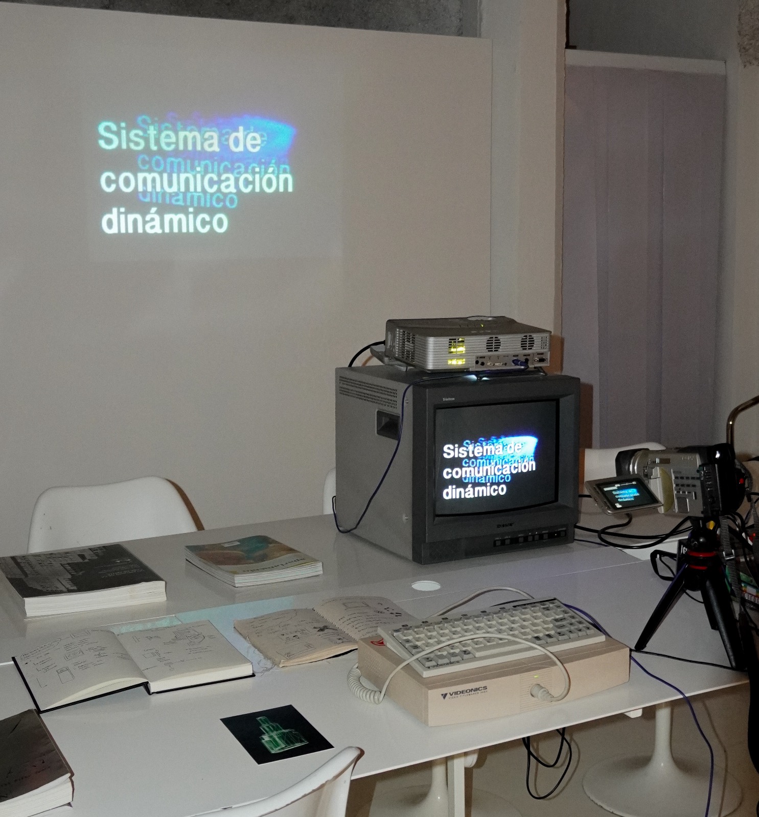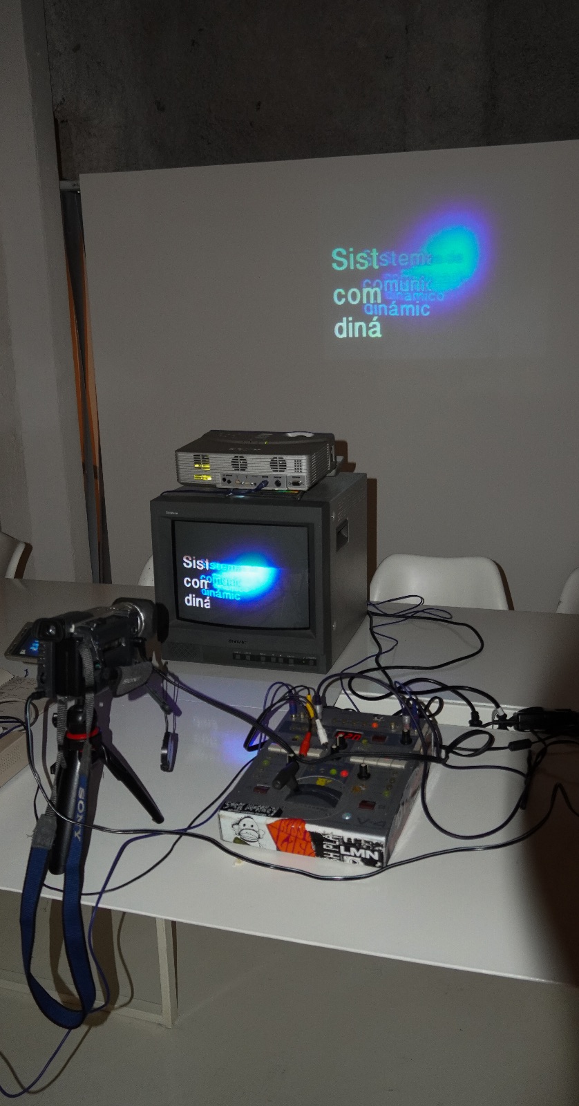 Instalación de TV art con monitor PVM, cámara Sony TRV900, proyector analógico Sony, mixer de video Edirol V4 y tituladora analógica VIDEONICS\ 2025\ melon_manga\ \ Instalación dinámica que combina tecnologías de video analógico en tiempo real. La mixer blendea entre el feedback generado por la interacción de cámara y monitor, y el texto "Sistema de comunicación dinámico" emitido por la tituladora. La obra plantea un diálogo sobre el alcance y la profundidad del lenguaje, adentrándose en la teoría de la semiosis infinita, donde la vida social se sostiene en discursos sobre discursos. Las letras aparecen como símbolos que se replican hacia un bucle infinito, en una coreografía audiovisual que reflexiona sobre los límites del sentido.